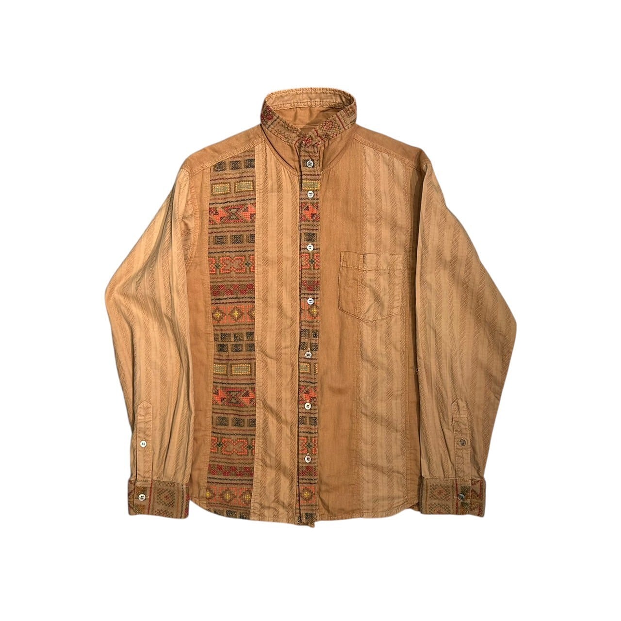 “FINAL HOME” Light brown cotton base switch design L/S stand collar shirt