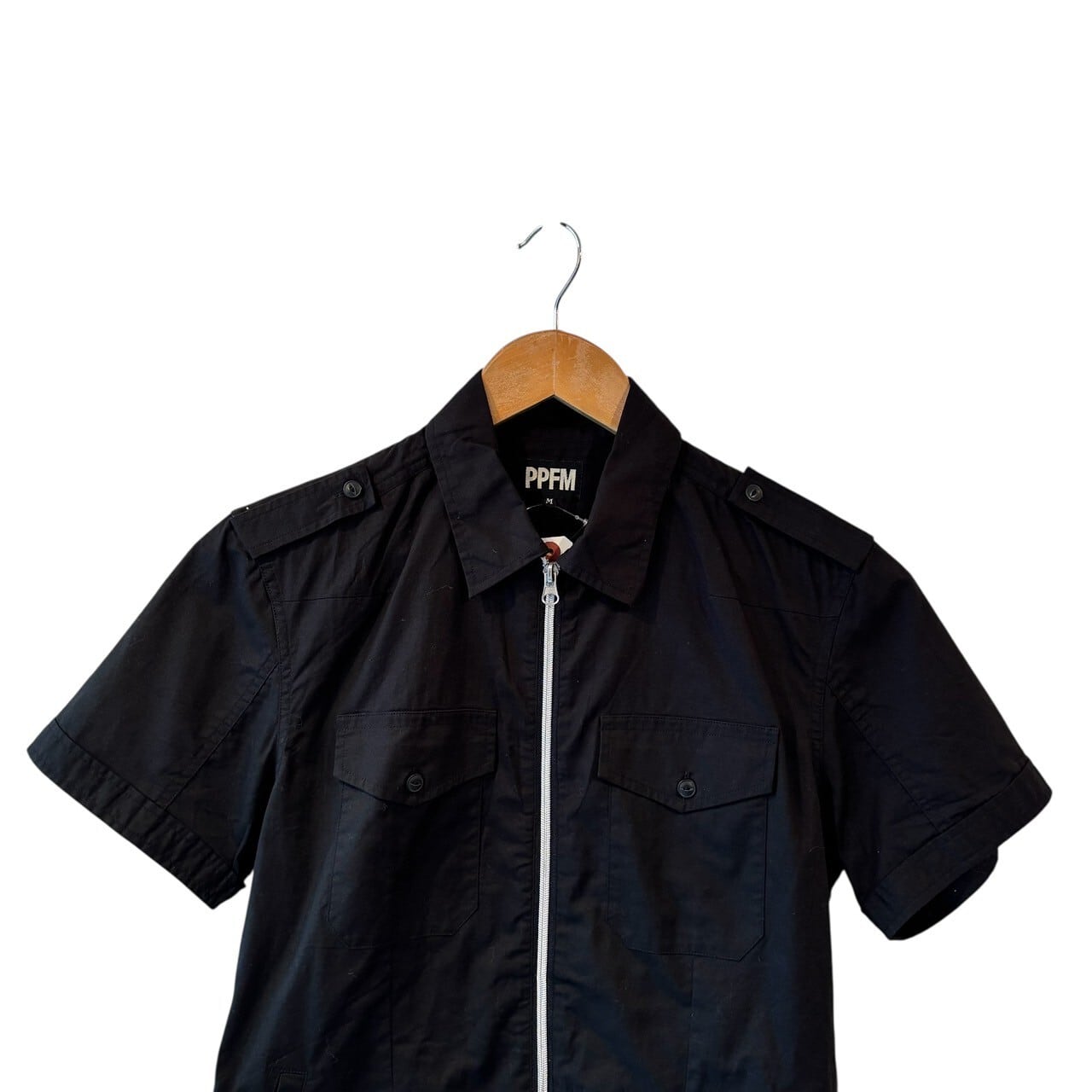 “PPFM” Black cotton design S/S zip up shirt