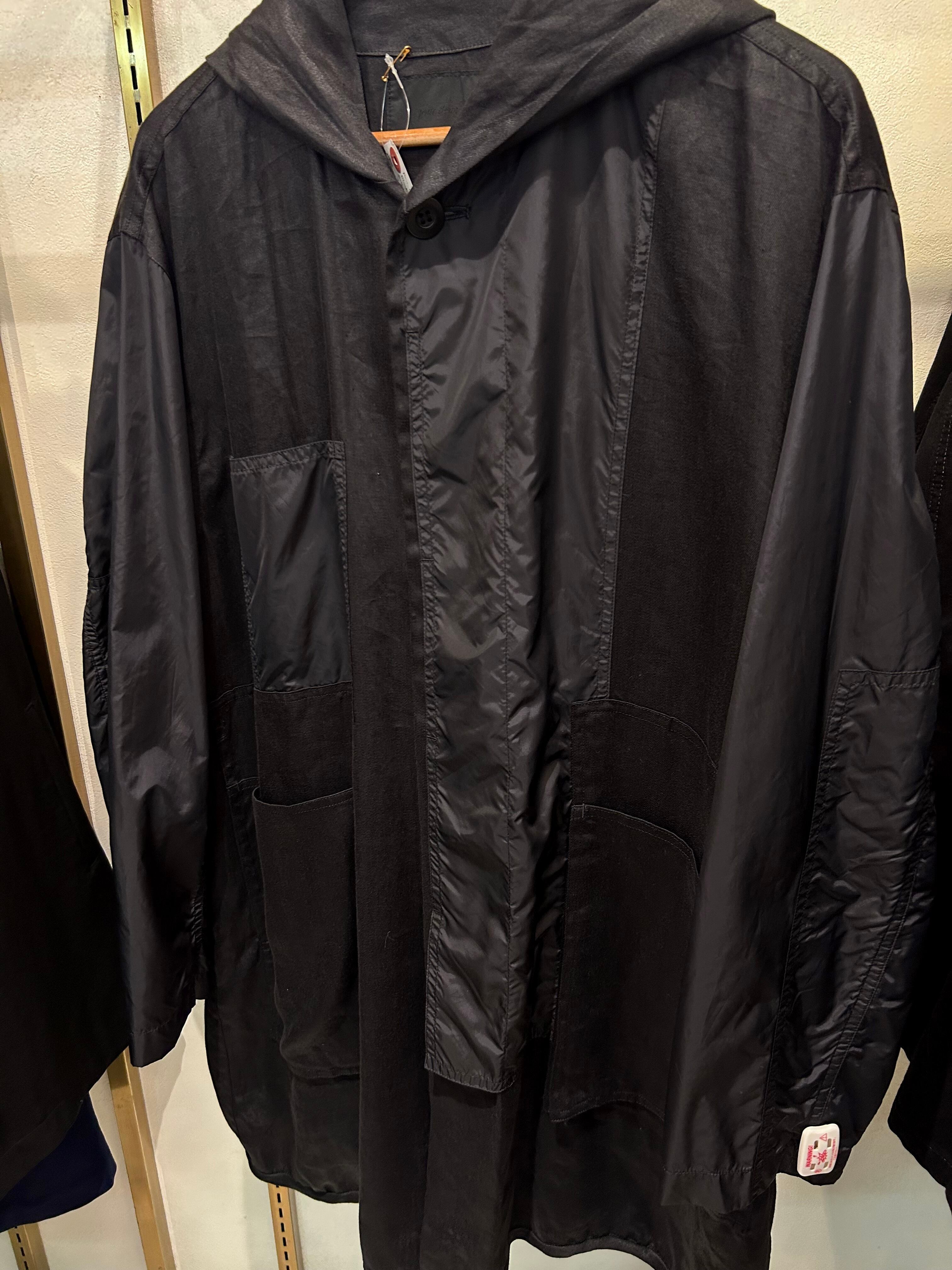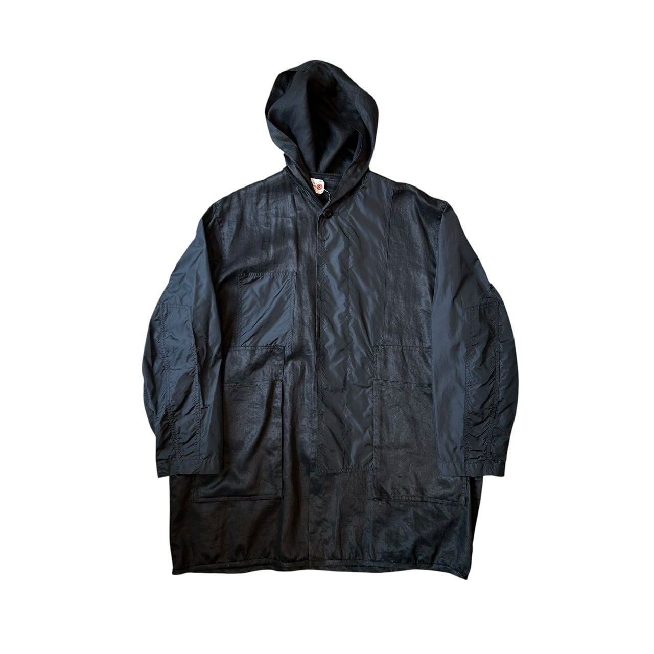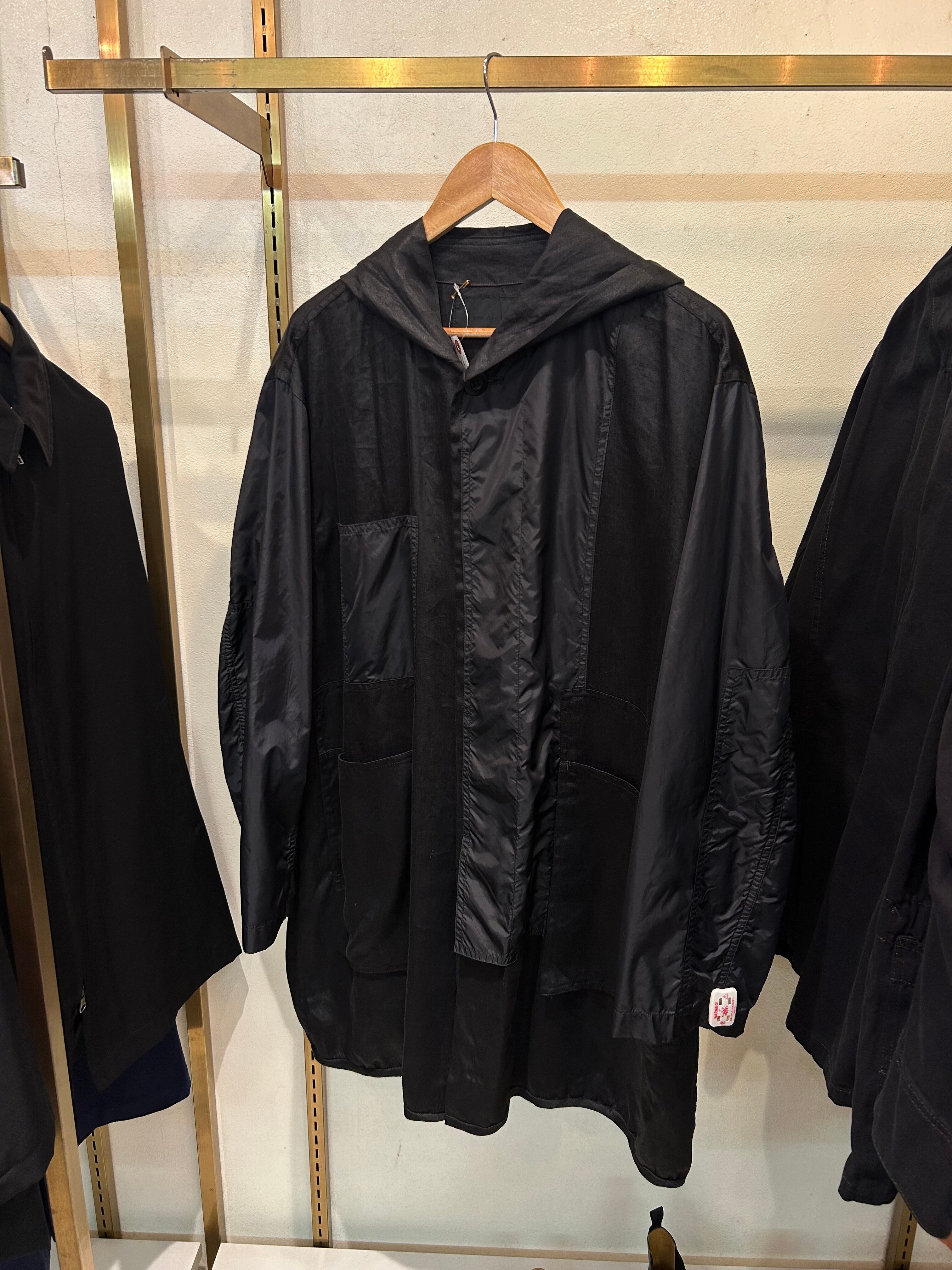 “pour deux” Black linen/nylon switch fly front hooded coat