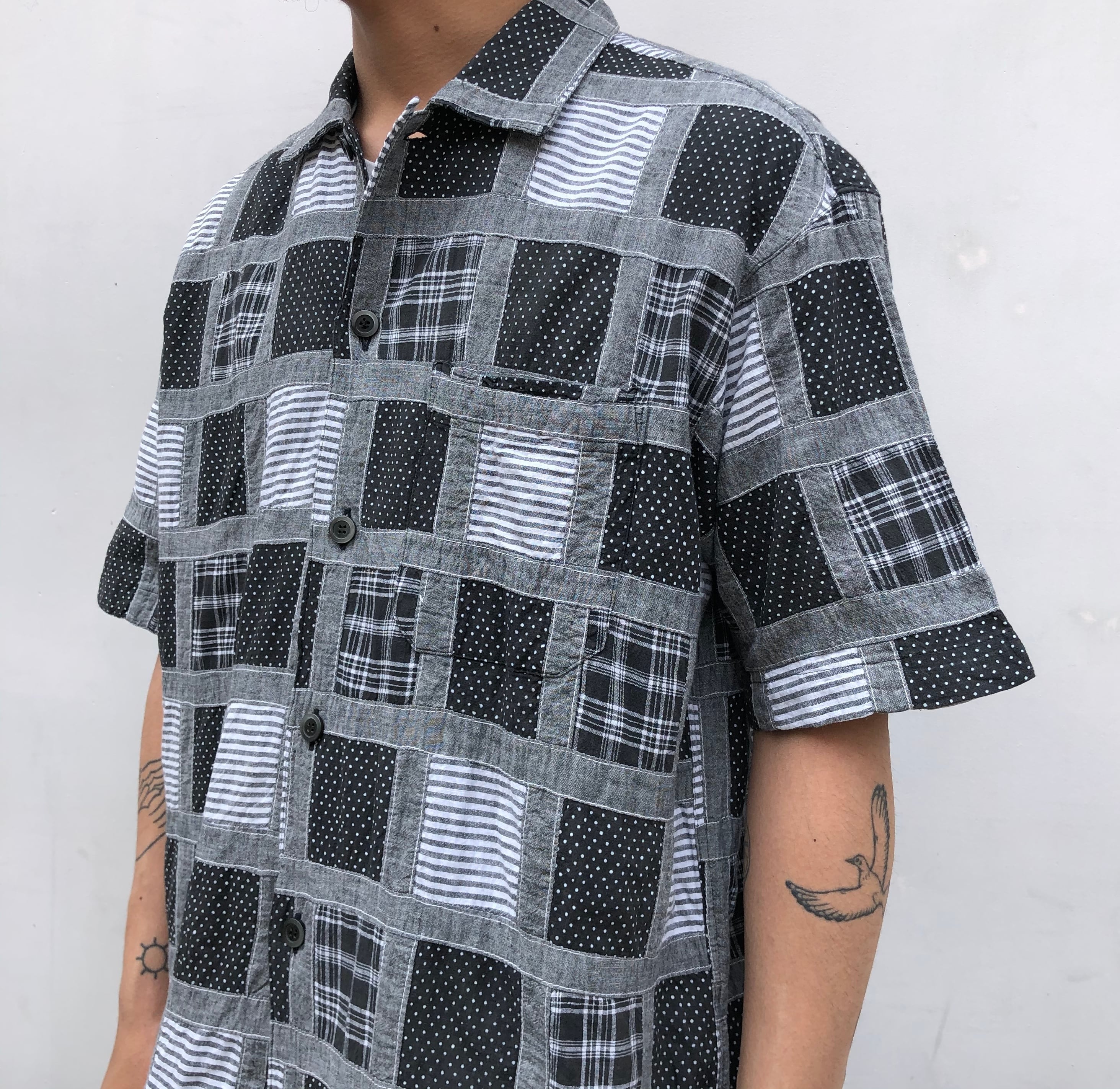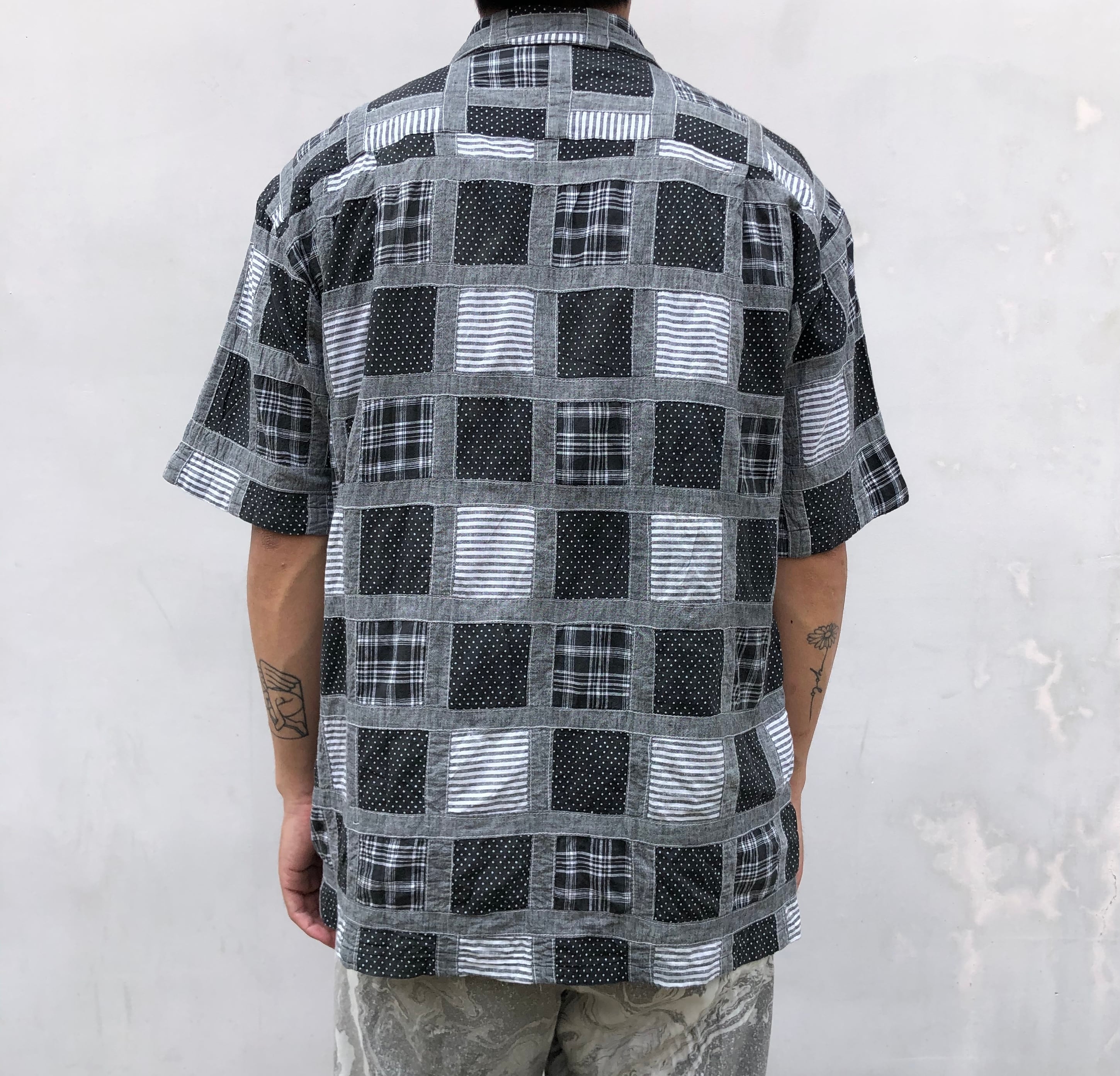 "DOMON" cotton patchwork design S/S open collar shirt