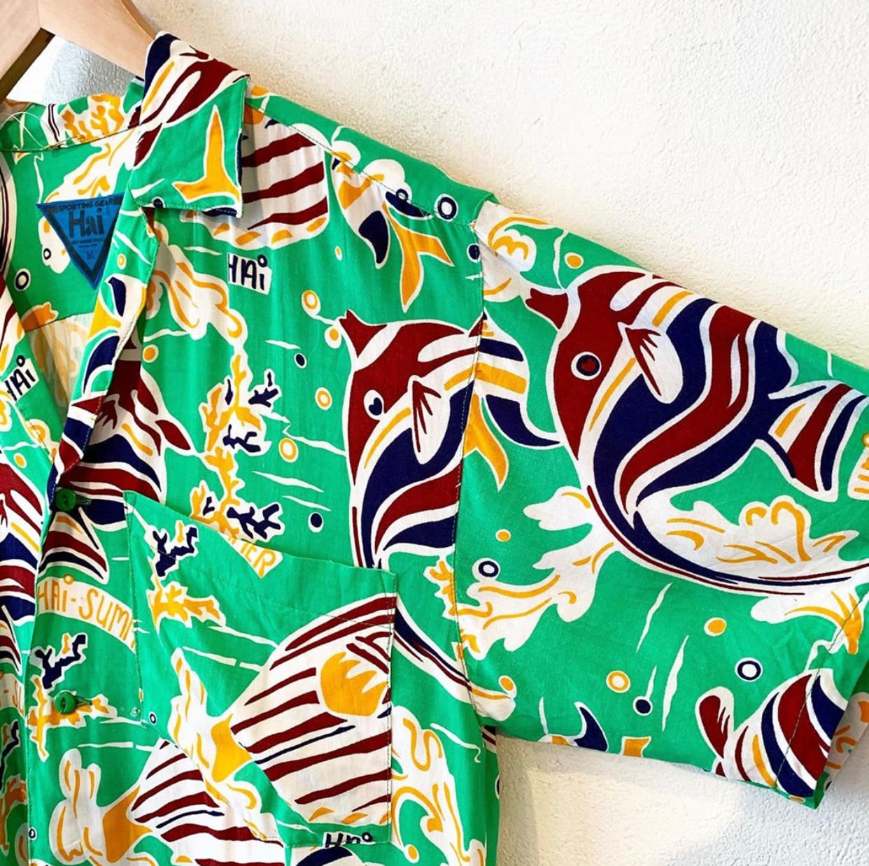 "ISSEY MIYAKE HAI" fish pattern rayon open collar s/s aloha shirt