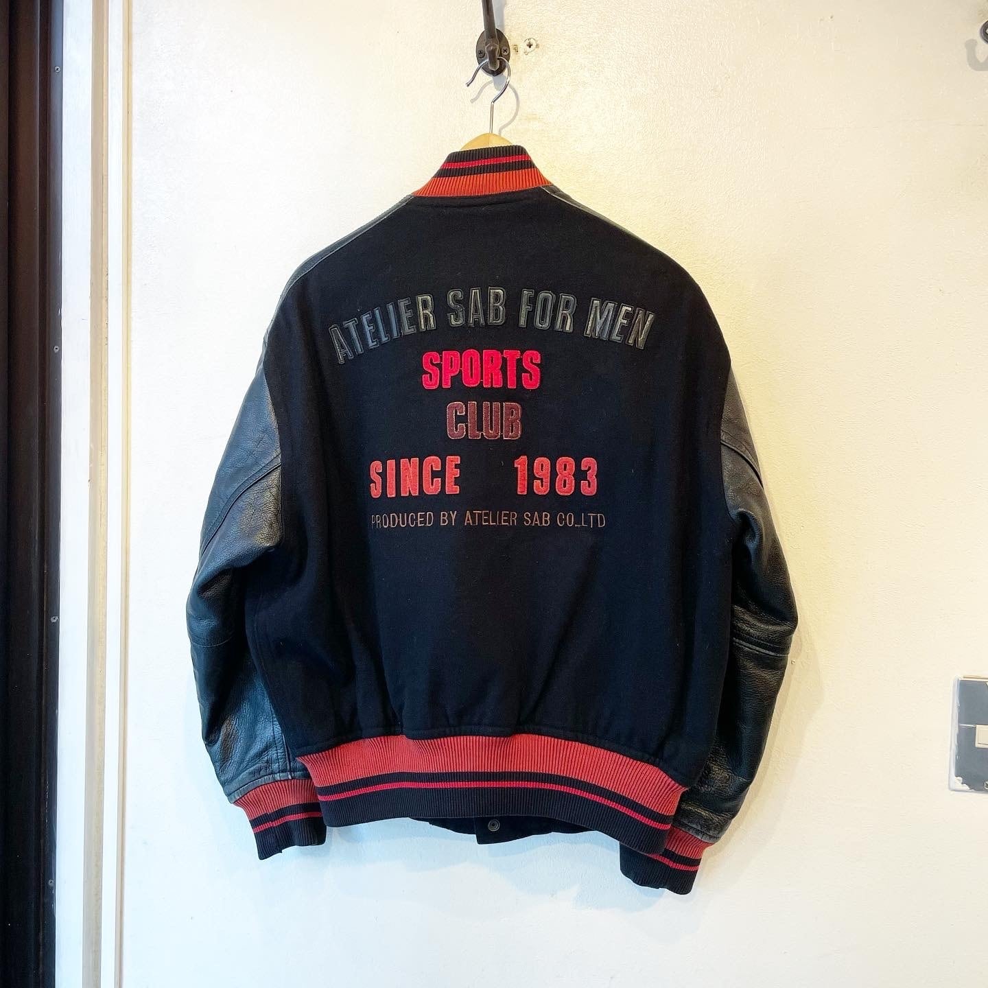 "ATELIER SAB" black×red wool/nylon/leather stadium jumper