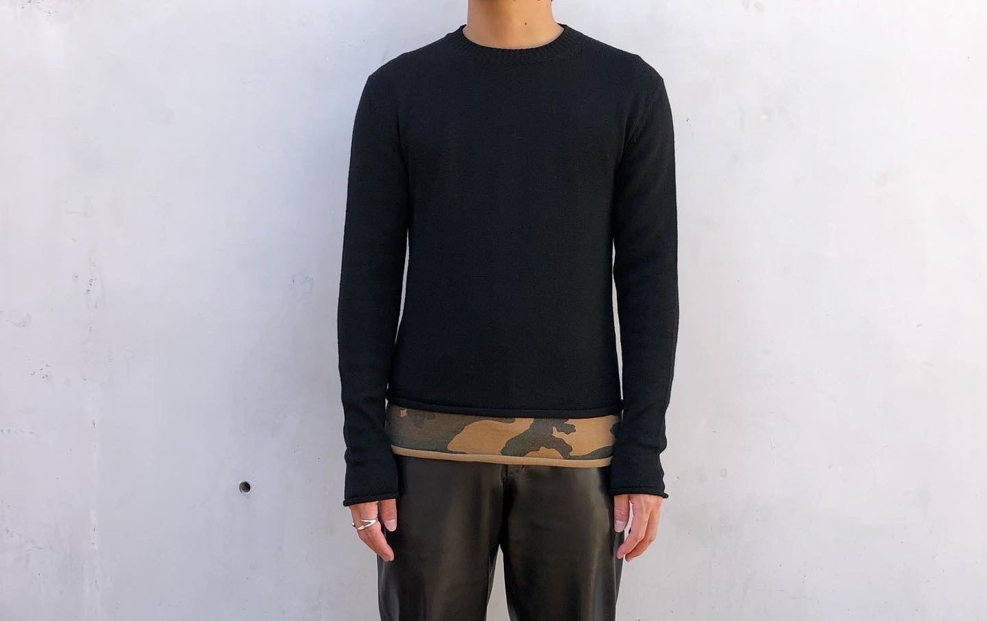 "GIULIANO FUJIWARA" Black × camoflage switch wool design crewneck sweater