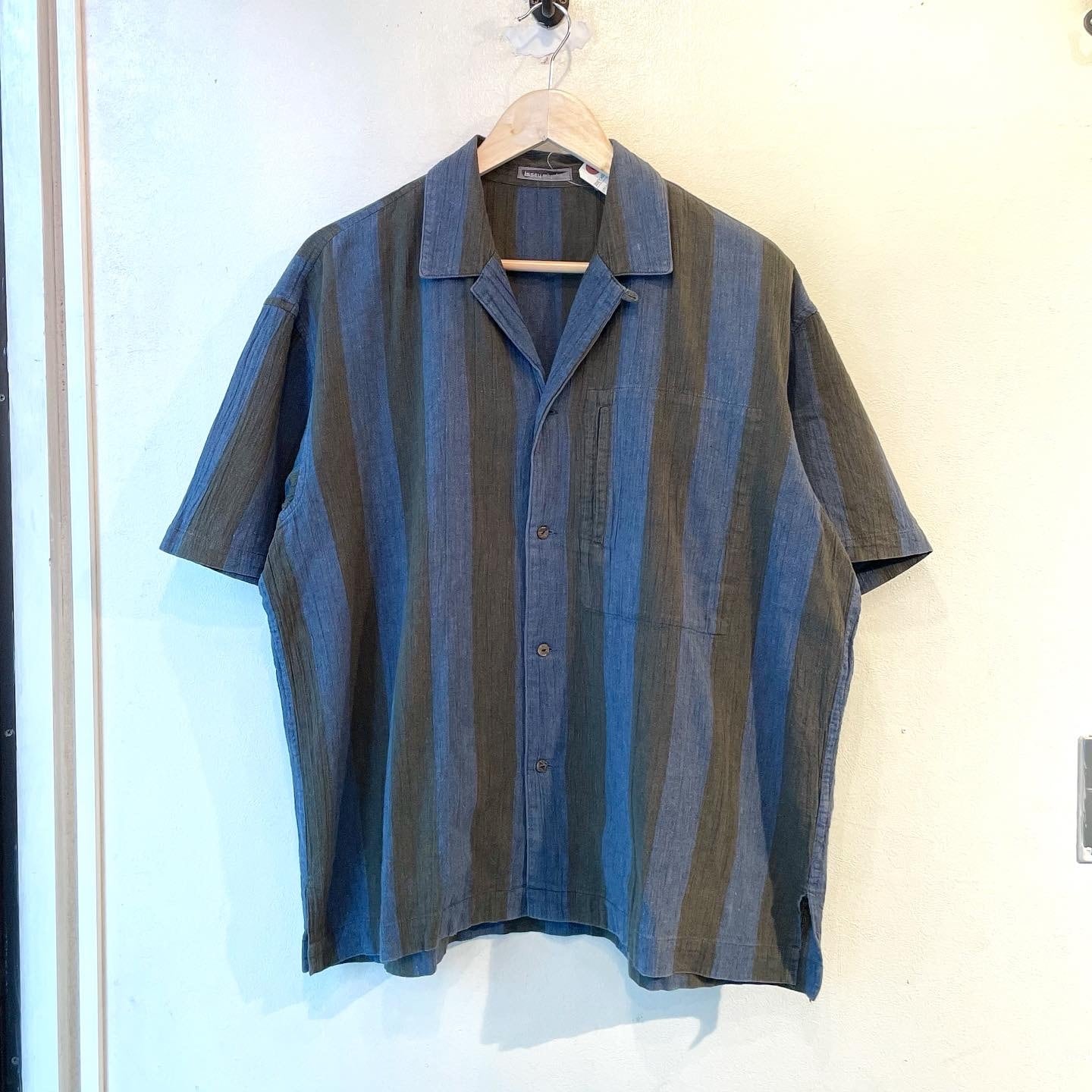 "ISSEY MIYAKE MEN" ● indigo/charcoal cotton/Linen stripe design S/S open collar shirt