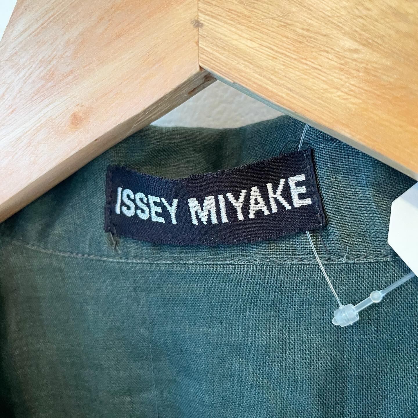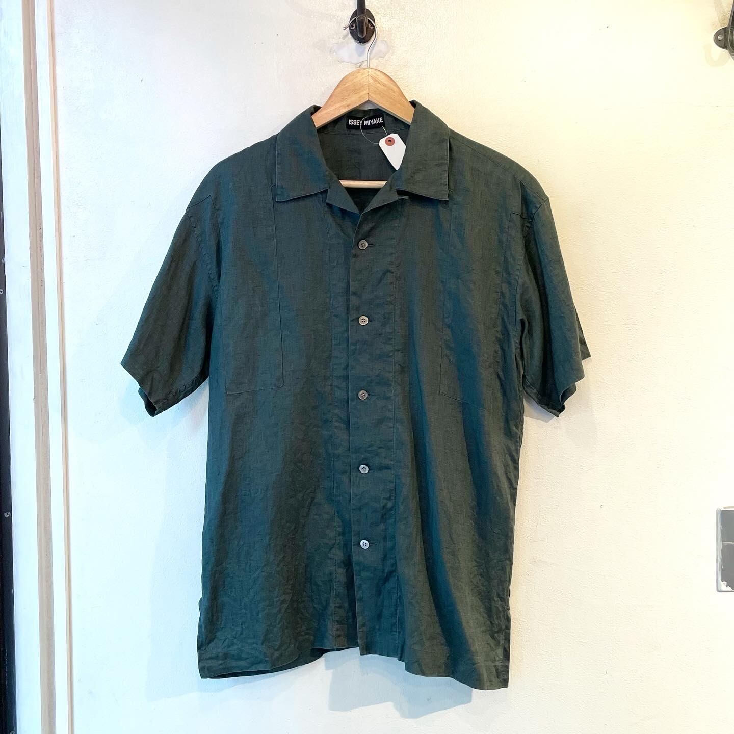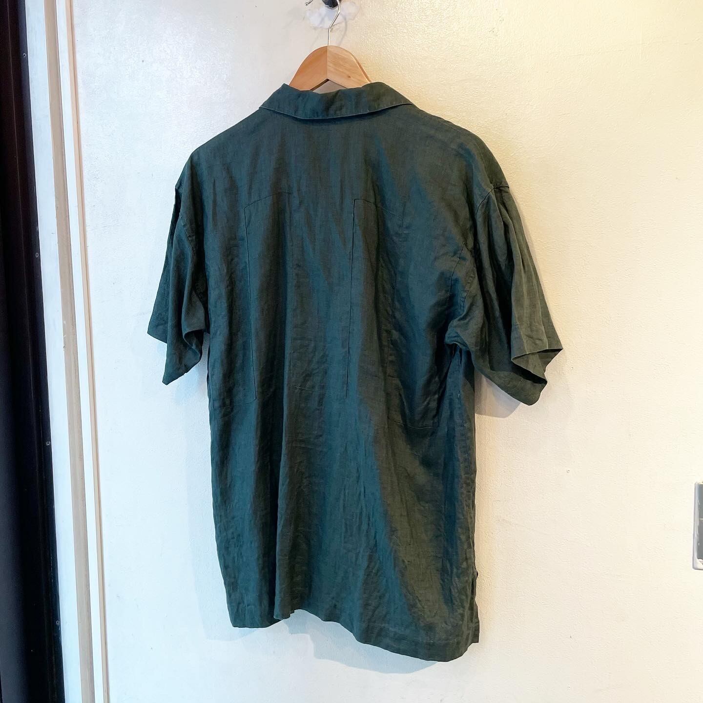 "ISSEY MIYAKE" ● Patch work moss green linen design S/S open collar shirt