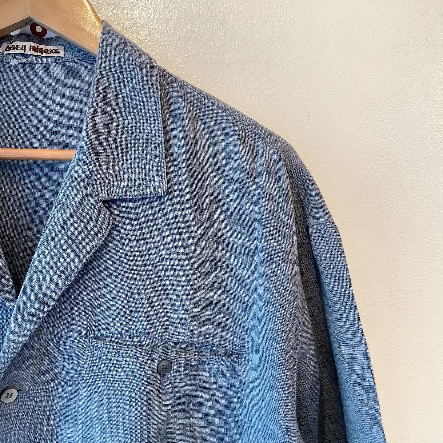 "ISSEY MIYAKE" ● Grey linen/cotton design S/S open collar shirt