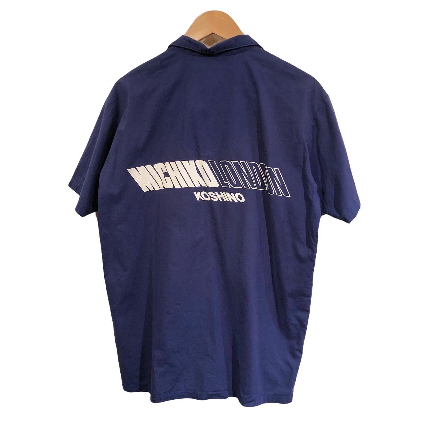 "MICHIKO LONDON" Navy cotton design S/S back printed open collar shirt